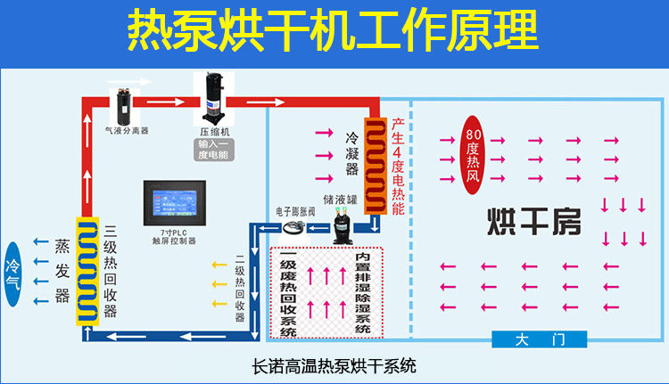 熱泵干燥機是利用逆卡諾原理,吸收空氣的熱量并將其轉(zhuǎn)移到房內(nèi),實現(xiàn)烘干房的溫度提高,配合相應(yīng)的設(shè)備實現(xiàn)物料的干燥。