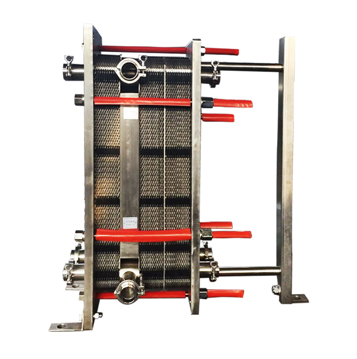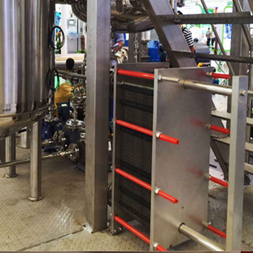寬信食品級(jí)不銹鋼板式換熱器是由一系列具有一定波紋形狀的金屬片疊裝、用不銹鋼夾板、不銹鋼標(biāo)準(zhǔn)件緊固而成的一種新型符合衛(wèi)生食品級(jí)要求的換熱器。板片之間形成薄矩形通道,通過(guò)板片進(jìn)行熱量交換。工作流體在兩塊板片間形成的窄小而曲折的通道中流過(guò)。冷熱流體依次通過(guò)流道,中間有一隔層板片將流體分開(kāi),并通過(guò)此板片進(jìn)行換熱。