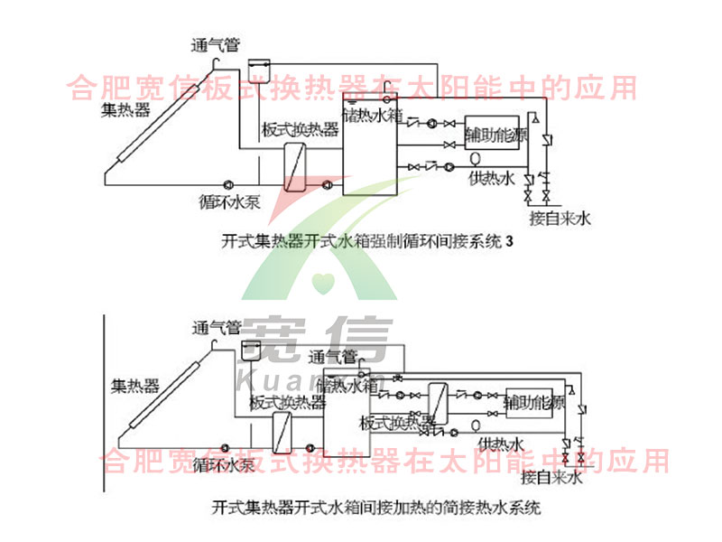 當(dāng)集熱器中的傳熱工質(zhì)為防凍液時(shí):間接式熱水系統(tǒng)是指在太陽(yáng)能集熱器加熱某種傳熱工質(zhì)(防凍液),再利用該傳熱工質(zhì)(防凍液)通過(guò)熱交換器加熱儲(chǔ)熱水箱中的水。集熱器中的溫度不夠時(shí),輔助熱源需要通過(guò)板式換熱器對(duì)水箱進(jìn)行加熱,