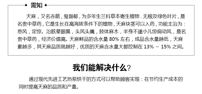 天麻,又名赤箭,鬼督郵,為多年生蘭科草本寄生植物.無根及綠色葉片,是名貴中草藥,它是生長在高海拔條件下的植物,天麻塊莖可以入藥,主治風(fēng)濕,眩暈頭痛等,它的經(jīng)濟價值高,以前依賴于野生,現(xiàn)在已人工栽培。更詳細(xì)的烘干方案請到如下網(wǎng)址索?。?/strong>