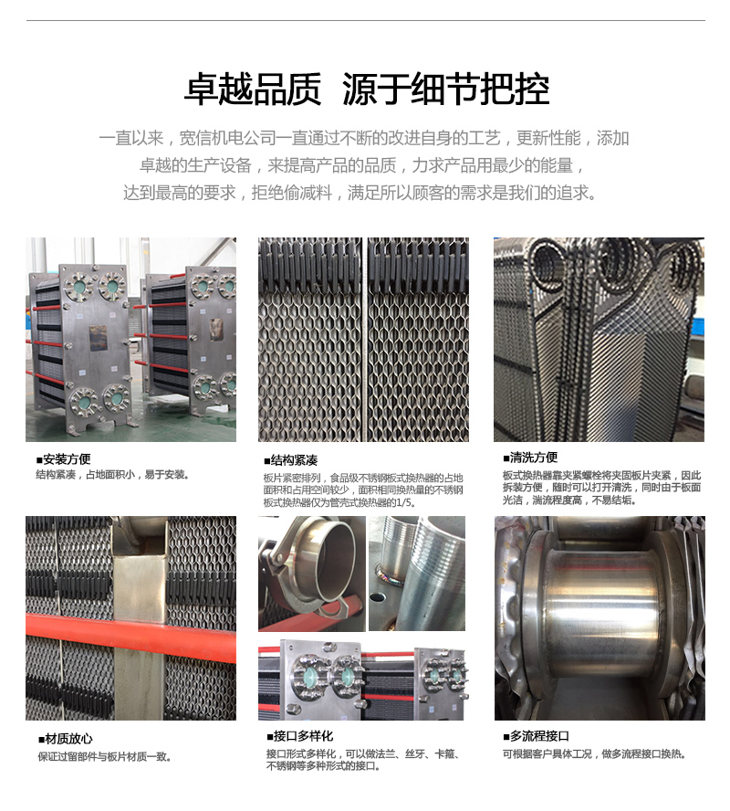 寬信公司是專業(yè)生產(chǎn)不銹鋼板式換熱器的生產(chǎn)廠家,嚴(yán)格按照《NB/T47004-2009》板式換熱器國家標(biāo)準(zhǔn)執(zhí)行,寬信在生產(chǎn)板式換熱器的基礎(chǔ)上,研制開發(fā)了具有國際先進(jìn)技術(shù)水平的新一代智能換熱機組,具有傳熱效率高,阻力小,結(jié)構(gòu)緊湊,運行可靠,操作簡單直觀等優(yōu)點,是高效率節(jié)能產(chǎn)品。