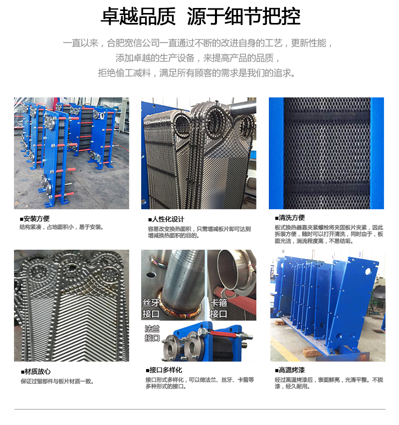 寬信公司是專業(yè)生產(chǎn)熱交換器的生產(chǎn)廠家,嚴(yán)格按照《GB16409-1996》板式換熱器國家標(biāo)準(zhǔn)執(zhí)行,寬信在生產(chǎn)板式換熱器的基礎(chǔ)上,研制開發(fā)了具有國際先進(jìn)技術(shù)水平的新一代智能換熱機(jī)組,具有傳熱效率高,阻力小,結(jié)構(gòu)緊湊,運(yùn)行可靠,操作簡單直觀等優(yōu)點(diǎn),是高效率節(jié)能產(chǎn)品。