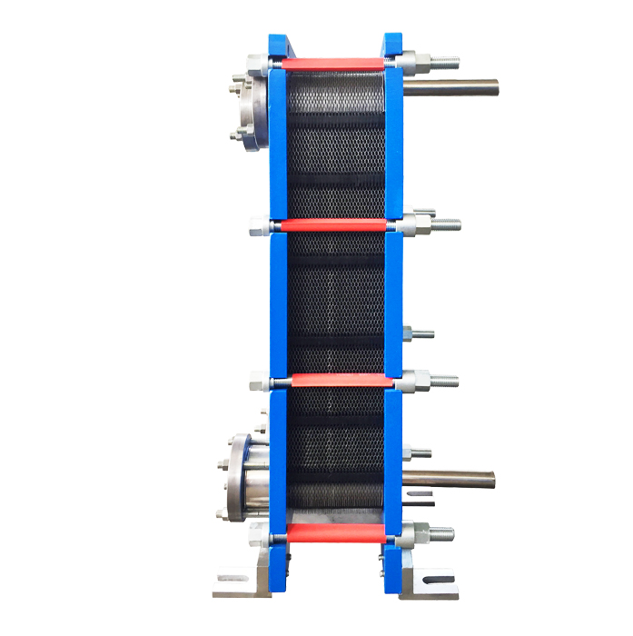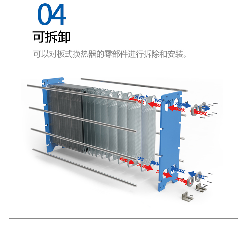 板式換熱器是由一組波紋金屬板組成,板片上有四個角孔,以供熱交換的兩種液體通過。金屬板片安裝在一個側(cè)面有固定板和活動壓緊板的框架內(nèi),并用夾緊螺栓夾緊。板片上裝有密封墊片,將流體通道密封,并且引導(dǎo)流體交替地流至各自通道內(nèi)波紋板不僅提高了湍流程度,并且形成許多支撐點,足以承受介質(zhì)間的壓力差。金屬板和活動壓緊板懸掛在上導(dǎo)桿,并由下導(dǎo)桿定位,而桿端則固定在支撐柱上。