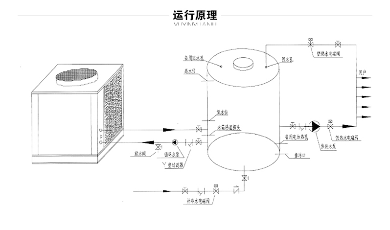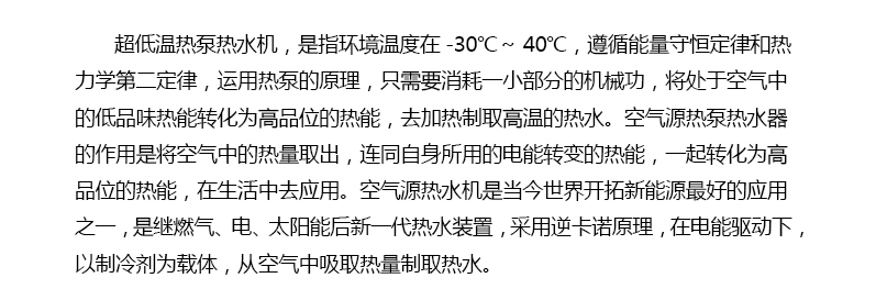 超低溫熱泵熱水機,是指環(huán)境溫度在-30℃~40℃,遵循能量守恒定律和熱力學第二定律,運用熱泵的原理,只需要消耗一小部分的機械功,將處于空氣中的低品味熱能轉(zhuǎn)化為高品位的熱能,去加熱制取高溫的熱水。空氣源熱泵熱水器的作用是將空氣中的熱量取出,連同自身所用的電能轉(zhuǎn)變的熱能,一起轉(zhuǎn)化為高品位的熱能,在生活中去應用??諝庠礋崴畽C是當今世界開拓新能源最好的應用之一,是繼燃氣、電、太陽能后新一代熱水裝置,采用逆卡諾原理,在電能驅(qū)動下,以制冷劑為載體,從空氣中吸取熱量制取熱水。
