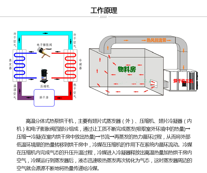 高溫整體式熱泵烘干機(jī)采用空氣能原理,整體式集成系統(tǒng),嵌入式設(shè)計(jì),配置高溫壓縮機(jī),高溫冷媒,微電腦PLC全自動(dòng)控制,7寸大屏觸摸屏,,24小時(shí)全自動(dòng)運(yùn)行,對(duì)溫度和濕度精確控制,閉環(huán)除濕,達(dá)到快速升溫,快速除濕的目的,最大程度的提高了烘干效率。