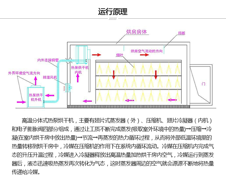 高溫分體式熱泵烘干機采用空氣能原理,整體式集成系統(tǒng),嵌入式設計,配置高溫壓縮機,高溫冷媒,微電腦PLC全自動控制,7寸大屏觸摸屏,24小時全自動運行,對溫度和濕度精確控制,閉環(huán)除濕,達到快速升溫,快速除濕的目的,最大程度的提高了烘干效率。