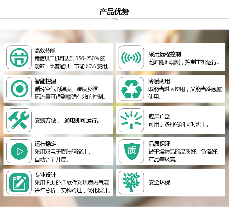 寬信熱泵烘干針對客戶特定品種,特定產(chǎn)量,特定要求給出一對一烘干方案,制定出唯一方案來達到客戶的要求,為客戶烘出一級品質(zhì)的物料,真正為客戶制定一套省心省錢的烘干方案,量身定制 + 長期跟蹤服務 + 上門安裝調(diào)試+ 技術指導 + 一級品品種。